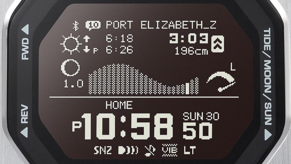 GBX-100は、G-LIDEのスマホ連携モデルで、潮汐情報や日の出/日の入を専用アプリ側で地点を選んで時計に反映できます。さらにMIP液晶で視認性も高く、屋外でも時刻や情報をパッと確認できます。